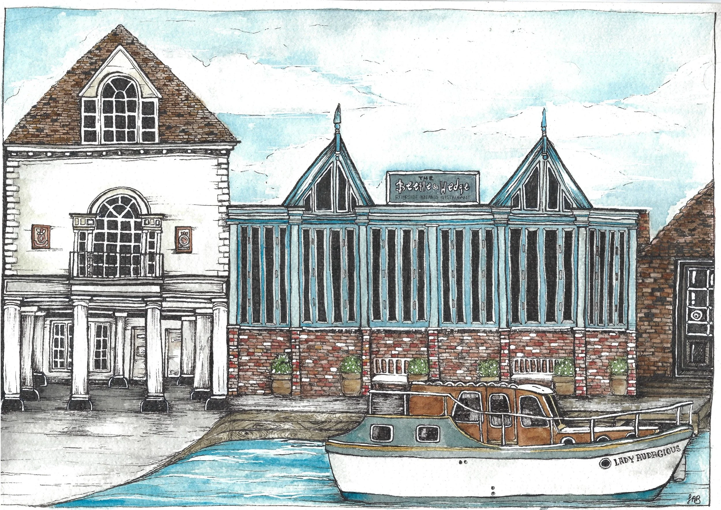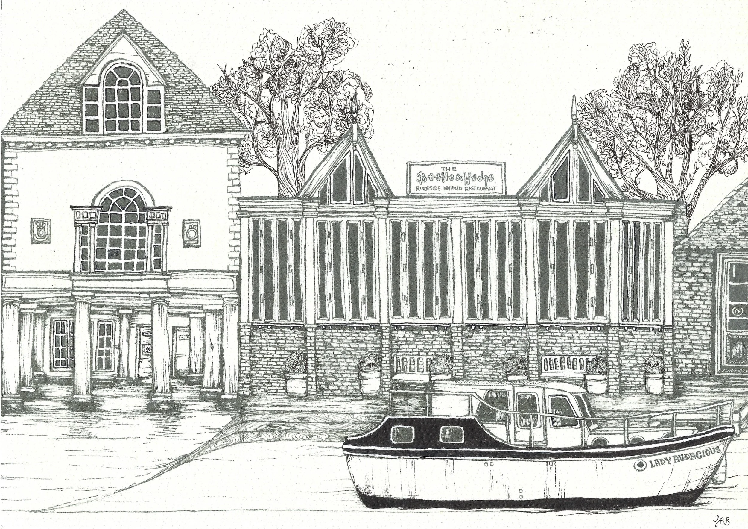 A commission request for a wedding gift that was lovely to work on. The client had asked for Wallingford town hall to be featured with the Beetle and Wedge in Moulsford. Having met on the river, it was important to have the boat featured too! I loved working on this project.